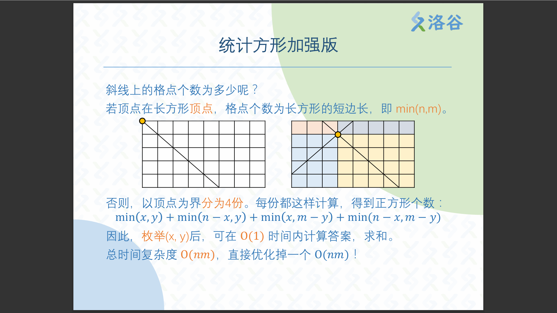 思路2:只需考虑右上角为 (x, y) 的情况,因此计算斜线上的顶点时,只需要向左下角一个方向拓展