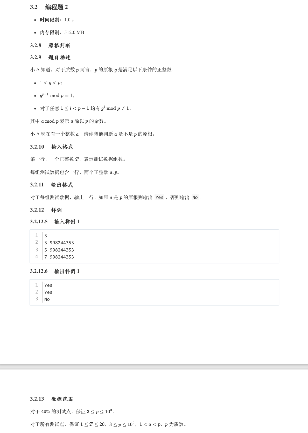 对于每组测试数据,输出一行,如果$a$ 是$p$ 的原根则输出